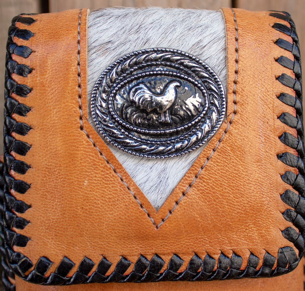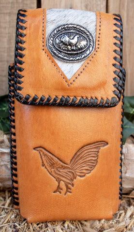 LEATHER ROOSTER Gallo STAMPED western cowboy rodeo cell phone case pouch with cowhair