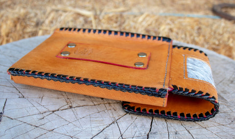 HANDMADE LEATHER ROOSTER STAMPED CELL PHONE CASE -Measures 7" height 3 3/8" width -Fits up to 2" width belt -COLOR BROWN & WHITE COW HAIR